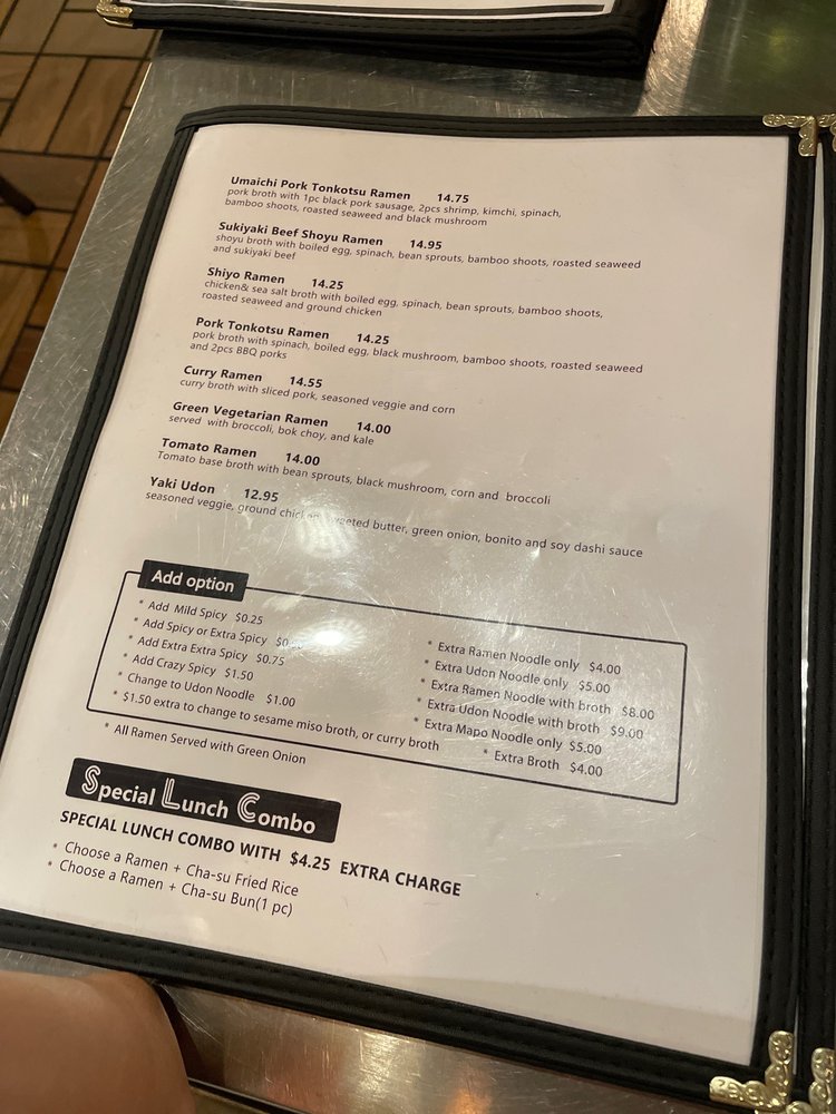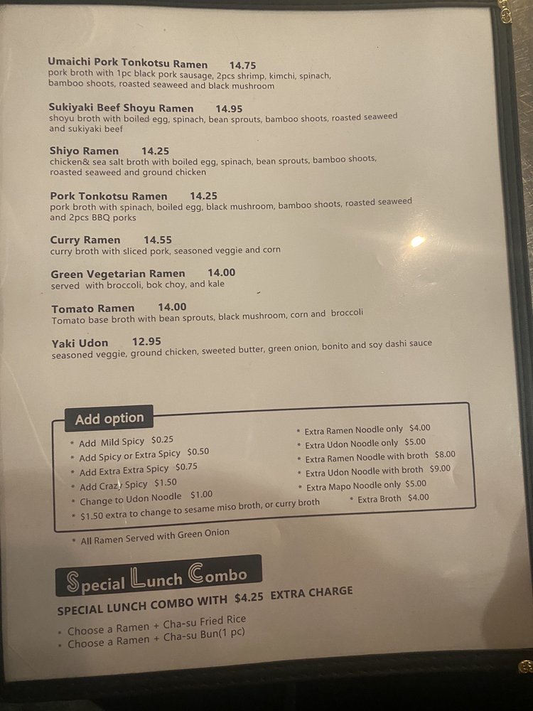 Umaichi Ramen, located in Santa Clarita, offers a variety of options for ramen enthusiasts. With a focus on fresh ingredients and flavorful dishes, this casual restaurant stands out for its delicious offerings. Customers rave about the Umaichi Tonkotsu ramen and Cham Pon Ramen soup, highlighting the rich umami broth and perfectly chewy noodles. The menu also includes options like the Pork Tonkatsu Ramen and cold noodle ramen, all prepared with attention to detail. Appetizers like garlic edamame and karaage buns add to the dining experience. Despite some minor disappointments with dishes like the chicken karaage, the overall ambiance and service receive praise. Umaichi Ramen is a hidden gem for those seeking quality ramen in a comfortable setting. Make sure to try out their unique flavors and don't forget to customize your spice level for an extra kick!